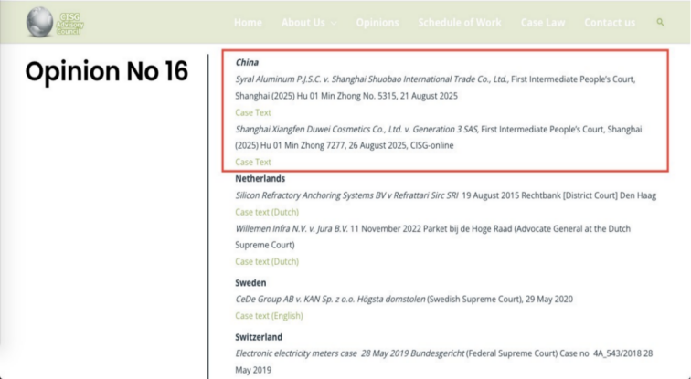 两案裁判文书对CISG的精准理解与适用,展现了上海国际商事法庭熟练运用国际条约处理前沿法律问题的专业能力和国际化审判水平。裁判文书经翻译成英文后,立即获得国际关注,并被CISG咨询委员会官网收录,为CISG在全球范围内的统一解释与适用贡献了具有说服力的中国案例,彰显了我国法院恪守国际条约义务、开放包容的良好司法形象,也为我国法院深度参与国际经贸规则制定、提升司法国际公信力作出了一次有益探索。